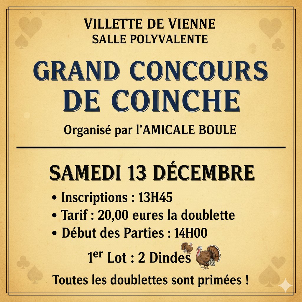 L'Amicale Boule de Villette de Vienne vous invite à son Grand Concours de Coinche ! Sortez les cartes et préparez-vous pour une après-midi conviviale et pleine de suspense !